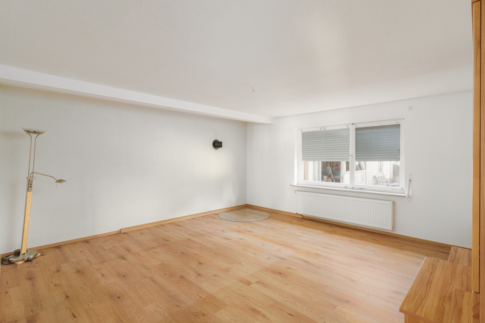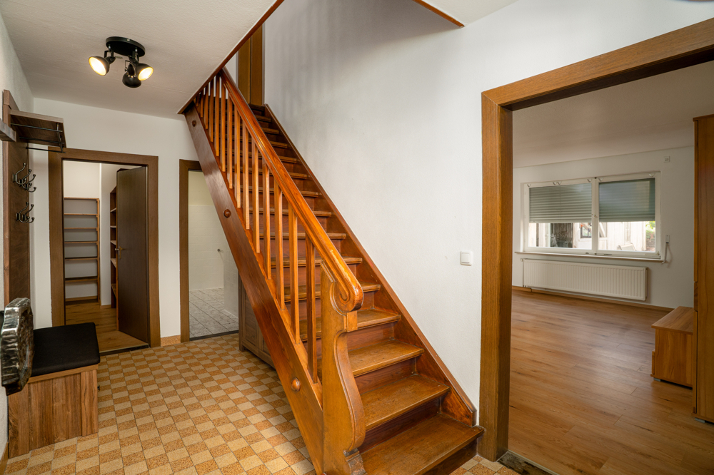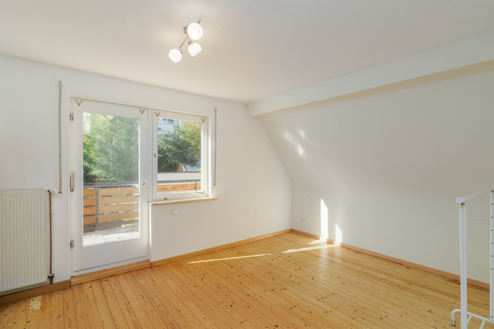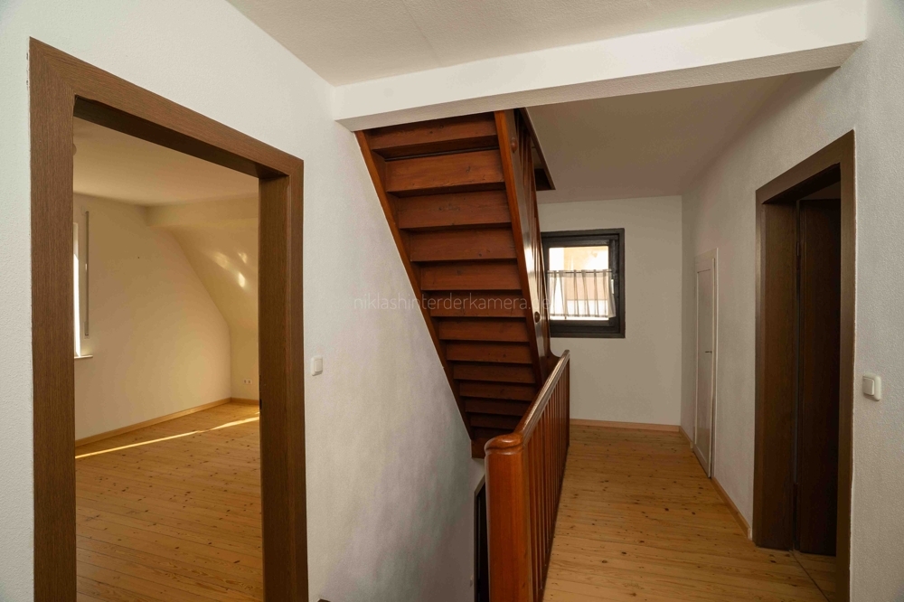 Im Obergeschoss stehen weitere gemütliche Zimmer zur Verfügung – eines davon mit Zugang zum Balkon. Besonders charmant: In mehreren Räumen, darunter das Esszimmer und die Zimmer im Obergeschoss, konnten die originalen Echtholzböden erhalten werden. Diese wurden 2018 fachgerecht abgeschliffen und neu eingelassen und verleihen dem Haus eine warme, natürliche Wohnatmosphäre.