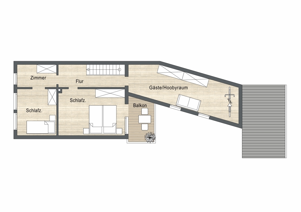 Das Obergeschoss unterteilt sich in drei weitere Zimmer. Ein Durchgang führt in den Anbau mit einem weiteren Zimmer, das flexibel als Gästezimmer oder Hobbyraum nutzbar ist.