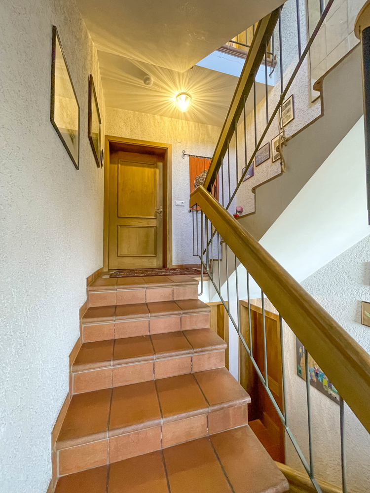Im Erdgeschoss des voll unterkellerten Wohnhauses unterteilt sich neben den großzügigen Fluren in einen gemütlicher Wohn-/Essbereich mit Kachelofen und direktem Zugang zur Terrasse, die daran angrenzende Küche, ein Schlafzimmer, ein Kinder- bzw. Arbeitszimmer und ein großer Hauswirtschaftsraum.