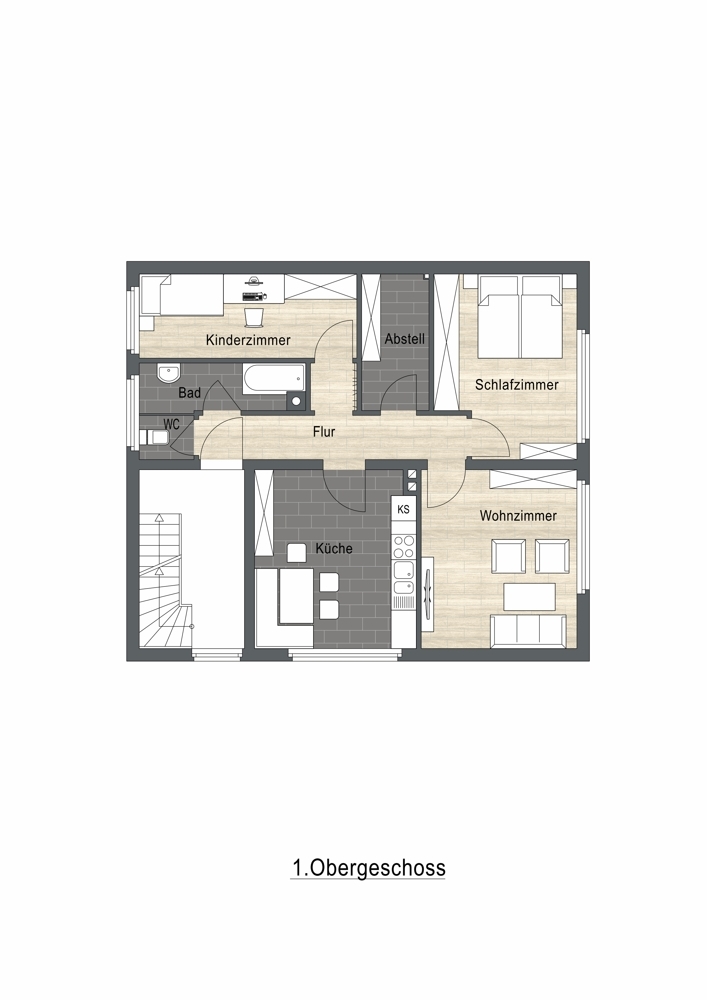 Die Wohnung im Obergeschoss wird zusätzlich durch einen Balkon ergänzt, der einen schönen Blick ins Grüne bietet.