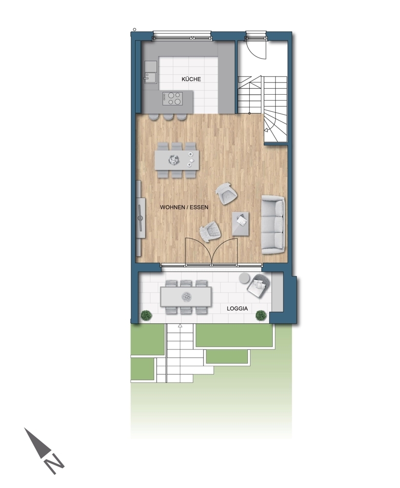 • Im EG Küche mit offenem Wohn-Ess-Konzept mit Blick auf die Loggia und