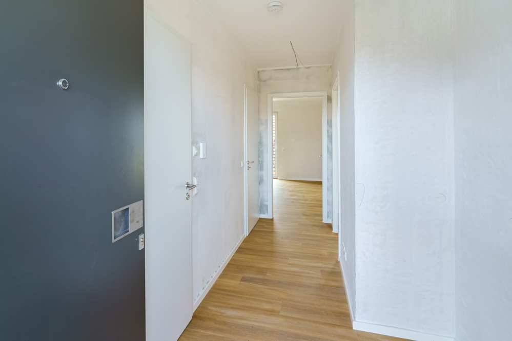 Moderne Ausstattung: Hochwertiger Design-Vinyl-Belag in stilvoller Holzoptik verleiht der Wohnung eine warme, einladende Atmosphäre. In den Badezimmern wurden edle, cremefarbene Feinsteinzeugfliesen verlegt – zeitlos und elegant.