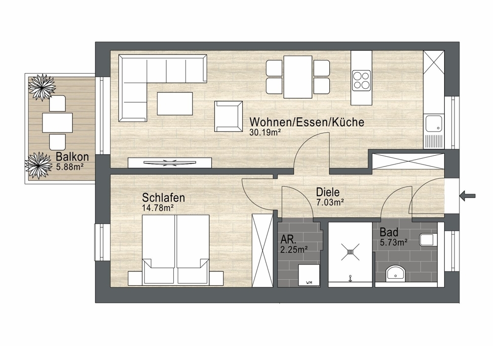 Helle und offene Raumgestaltung: Die Wohnung zeichnet sich durch eine clevere Raumaufteilung aus. Der helle Wohn- und Essbereich ist offen und großzügig gestaltet. Das Schlafzimmer bietet die nötige Privatsphäre.