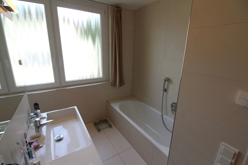 Das Badezimmer mit Tageslicht ist mit großformatigen Feinsteinzeugfliesen wohnlich gestaltet. Wellness-Freude entsteht durch die große, frei begehbare Dusche mit verglasten Seitenwänden in zeitloser Optik. Die Wohnräume sowie die Küche sind hochwertig ausgestattet und lassen keine Wünsche offen!