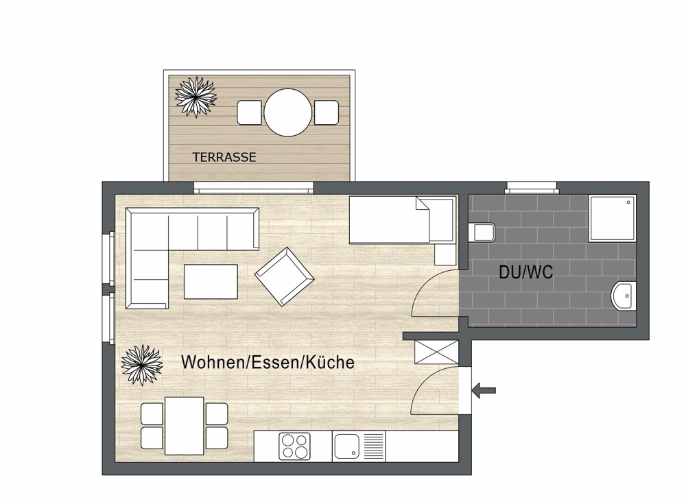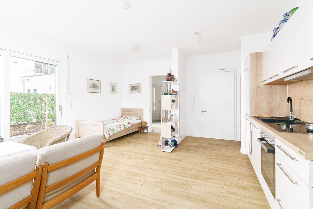 Der lichte Wohn-/Schlafbereich bindet die Küchenzeile funktional ein und öffnet sich zur Terrasse – ideal für den ersten Kaffee am Morgen oder eine ruhige Pause im Grünen.