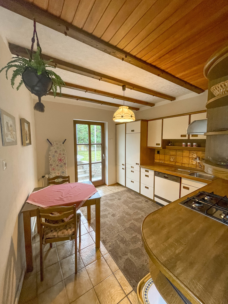 Im vorderen Bereich des Hauses befindet sich ein großzügiges Wohnzimmer sowie ein Essbereich mit herrlichem Blick auf Würzburg. Im hinteren Teil des Hauses befinden sich das große Schlafzimmer, die Küche mit direktem Zugang zur überdachten Terrasse sowie das Badezimmer mit Dusche und Wanne.