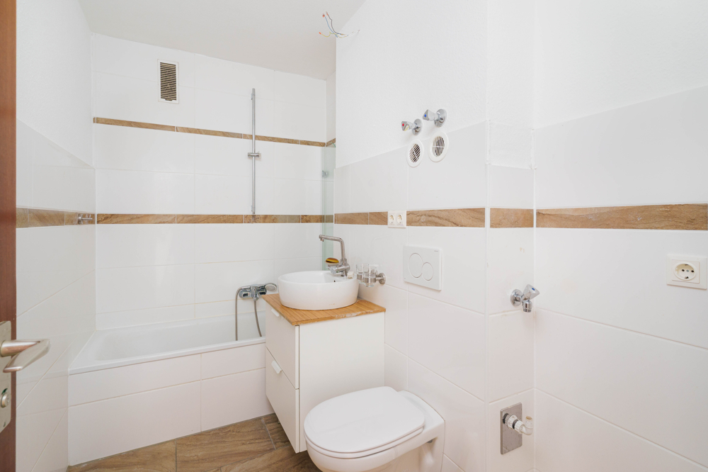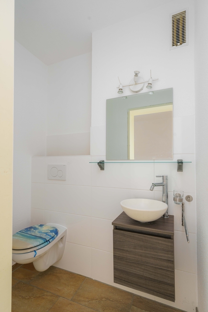 Das moderne Badezimmer ist mit Badewanne und Dusche ausgestattet und bietet viel Komfort. Zusätzlich steht ein separates Gäste-WC zur Verfügung, was besonders praktisch bei