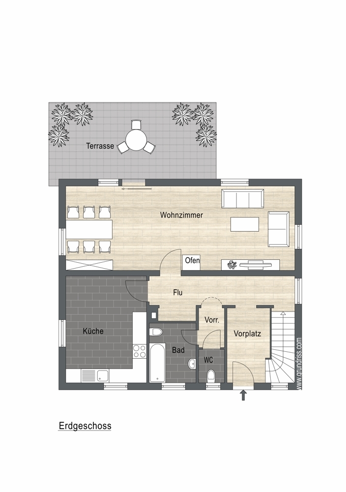 Im Erdgeschoss erwartet Sie der Lebensmittelpunkt des Hauses: Ein großzügiger Wohn- und Essbereich, der viel Platz für gemeinsame Stunden bietet und direkten Zugang zur Terrasse hat. Die angrenzende Küche ist praktisch gelegen. Ein Badezimmer mit Badewanne und Dusche sowie ein separates WC runden diese Etage ab und sorgen für zusätzlichen Komfort im Alltag.